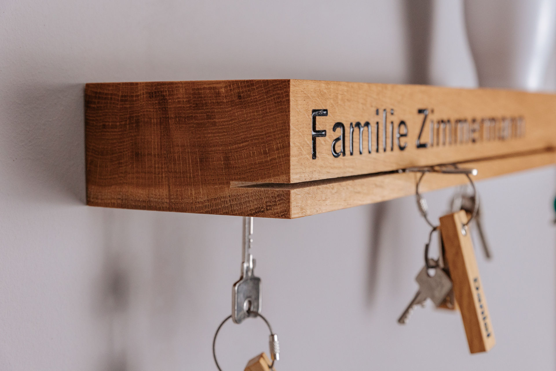 Die geölte Oberfläche betont die natürliche Maserung und Haptik des Holzes. Schlüsselschlitz und integrierte Magnete sorgen dafür, dass alles seinen Platz hat – ganz ohne Haken oder Bohrlöcher. Optional kannst du dein Schlüsselbrett mit einer Gravur oder farbigem Epoxidharz individuell gestalten.