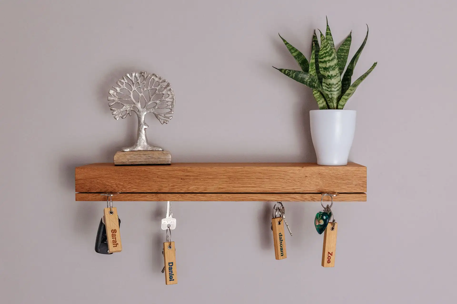 Unser Schlüsselbrett Eiche Pur steht für natürliche Eleganz und durchdachte Funktion. Gefertigt aus massivem Eichenholz (6 cm stark, 11,5 cm tief) bringt es Wärme, Ruhe und Struktur in deinen Eingangsbereich – ideal für alle, die minimalistisches, hochwertiges Design lieben.