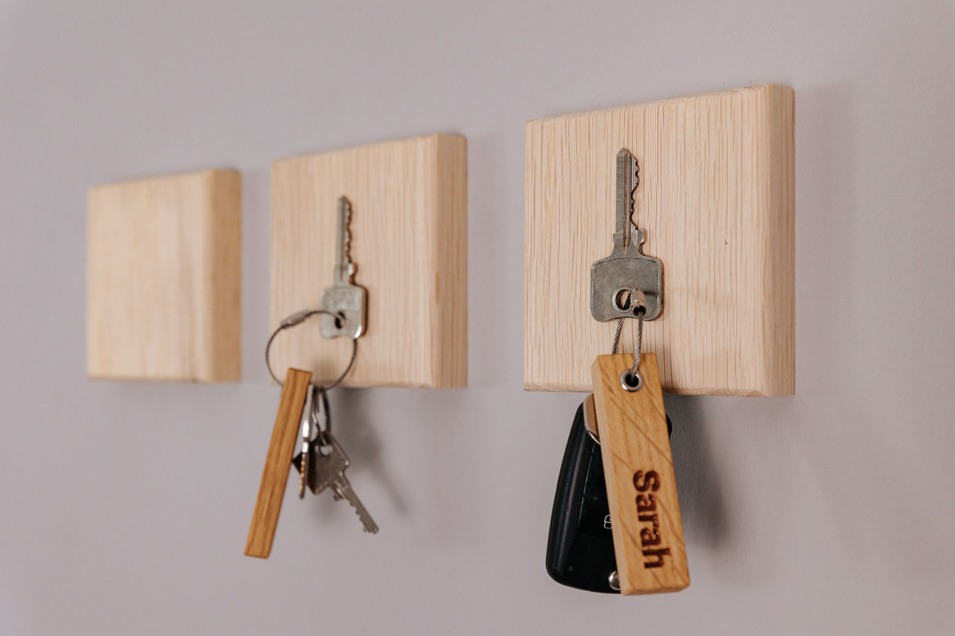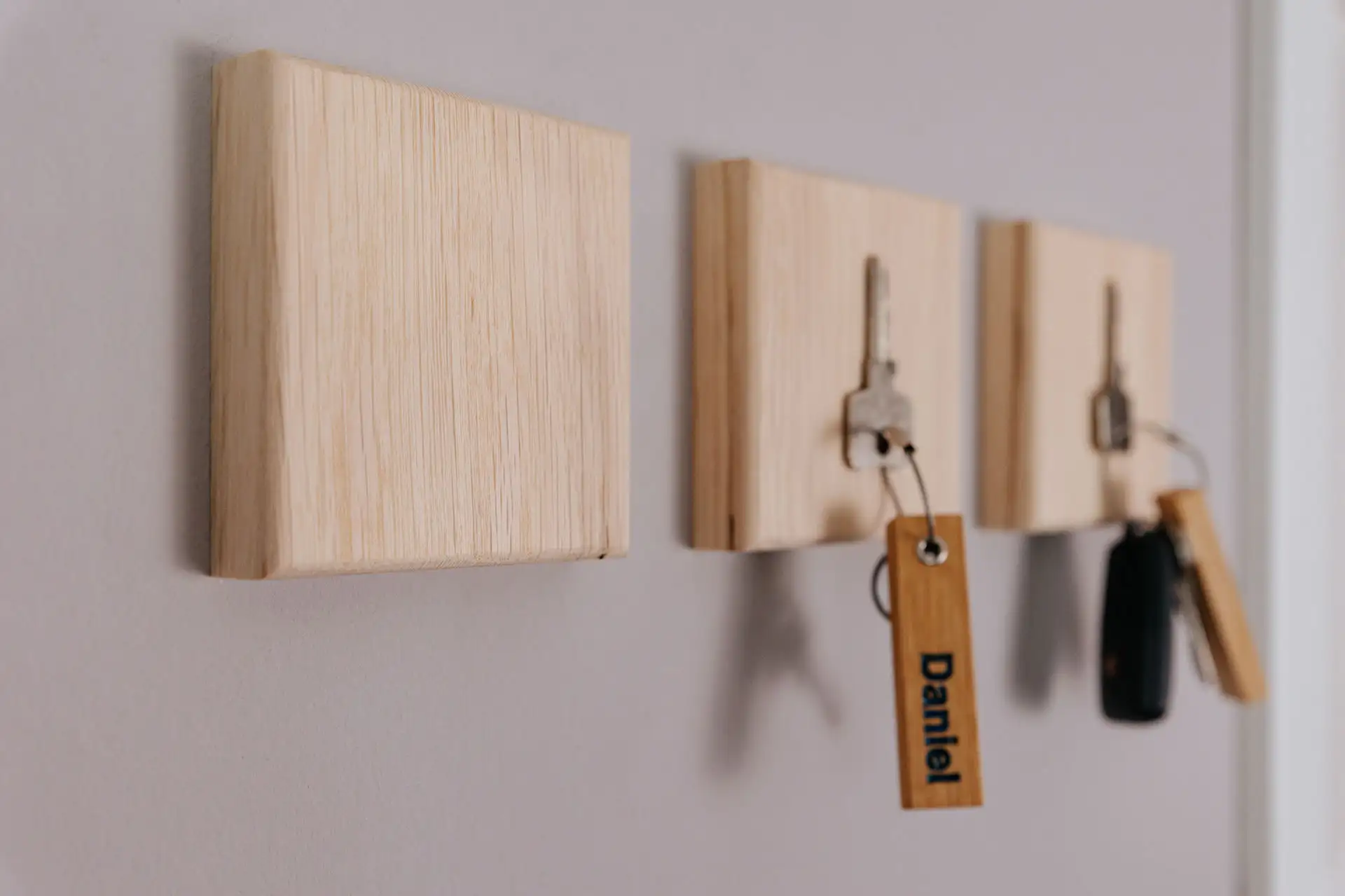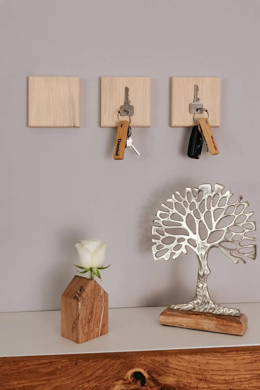 Schlüsselhalter im Format 10 × 10 × 2 cm aus massiver Eiche mit einem extra Starken Magneten an der Rückseite.