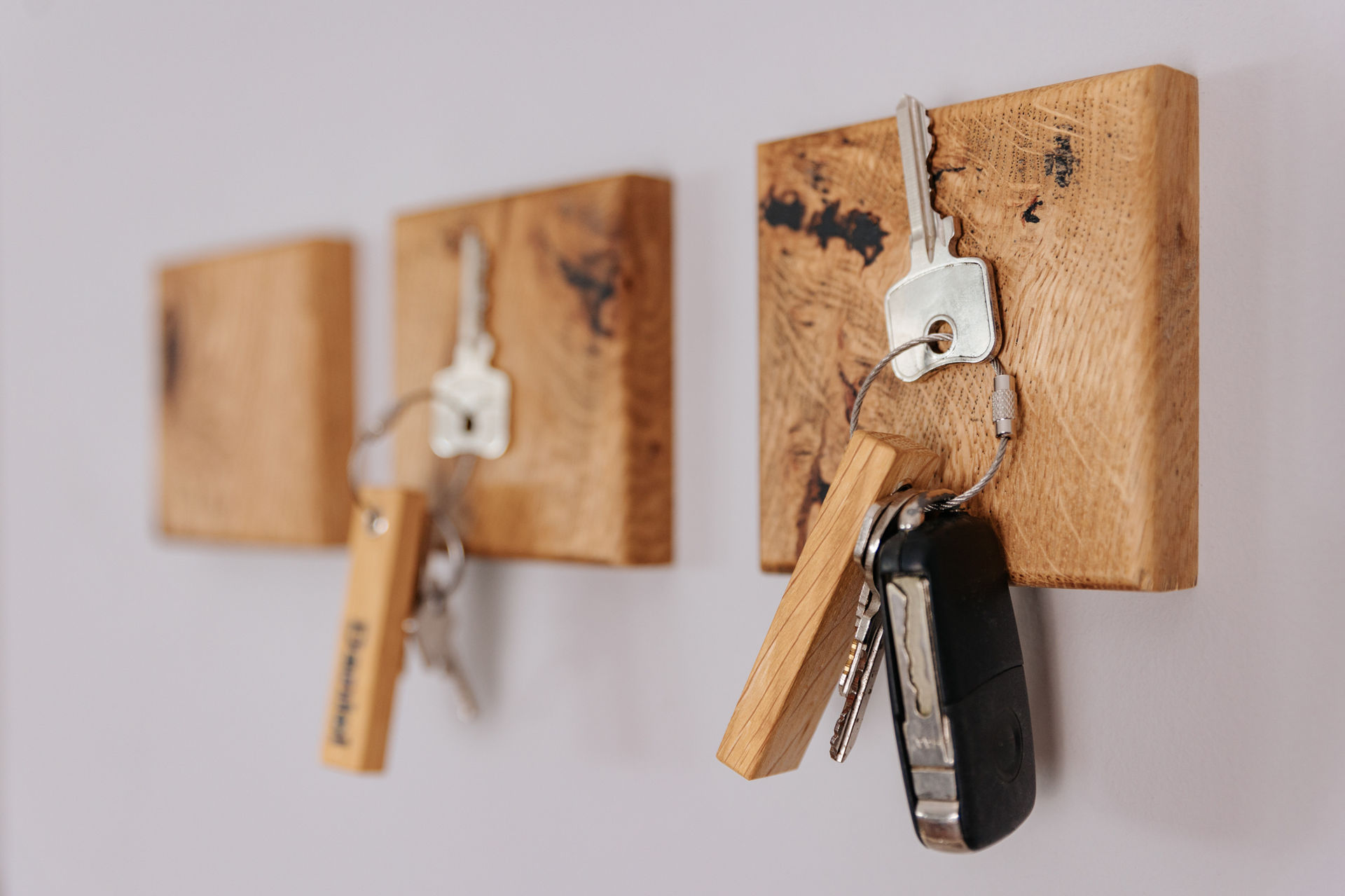 Schlüsselhalter im Format 10 × 10 × 2 cm aus massiver Eiche mit einem extra starken Magneten an der Rückseite.
